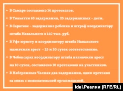5 мая в России прошла акция оппозиционного политика Алексея Навального "Он нам не царь". По данным "ОВД-Инфо", задержания прошли в 27 городах. Всего задержано более 1597 человек. Больше всего в Москве (719 человек), Санкт-Петербурге (217) и Челябинске (185). "Рекорд" среди городов Поволжья — Тольятти. Там задержали 65 человек, 25 из которых несовершеннолетние. "Idel.Реалии" рассказывают о последствиях акции в Поволжье.