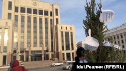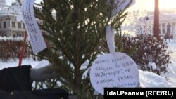 За пару минут до акции в чате пострадавших от действия банков заявили, что акция не состоится – на улице мороз. Но несколько вкладчиков Татфондбанка и Интехбанка все же нарядили сегодня елку напротив правительства республики открытками, на которых написали, что не получили в этот Новый год. За акцией наблюдал корреспондент "Idel.Реалий".