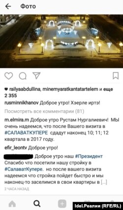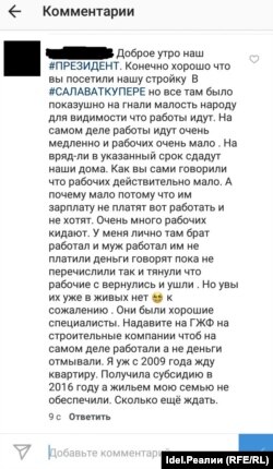 "Доброе утро, наш президент! Конечно, хорошо, что вы посетили нашу стройку в "Салават күпере", но всё там было показушно, нагнали малость народу для видимости, что работы идут. На самом деле, работы идут очень медленно и рабочих мало. А почему мало – потому что им зарплату не платят, вот работать и не хотят. Очень много рабочих кидают. У меня лично там брат работал и муж работал – им не платили деньги. Говорят, пока не перечислили. Так и тянули, что рабочие свернулись и ушли. ...Надавите на ГЖФ, на строительные компании, чтоб на самом деле работали, а не деньги отмывали. Я уж с 2009 года жду квартиру. ...Сколько еще ждать", – было написано в удаленном комментарии.
