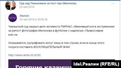 22 ноября прошлого года Новочебоксарский городской суд оправдал Дмитрия Панькова по статье 20.29 КоАП РФ (Производство и распространение экстремистских материалов), не найдя признаков экстремизма в его публикации фото депутата Госдумы Виталия Милонова с подписью "Право... или смерть". Лозунг признан экстремистским, однако это словосочетание запрещено лишь в случае, если оно оканчивается восклицательным знаком. Новочебоксарский городской суд признал, что в подписи Панькова восклицательный знак отсутствует и закрыл дело.
