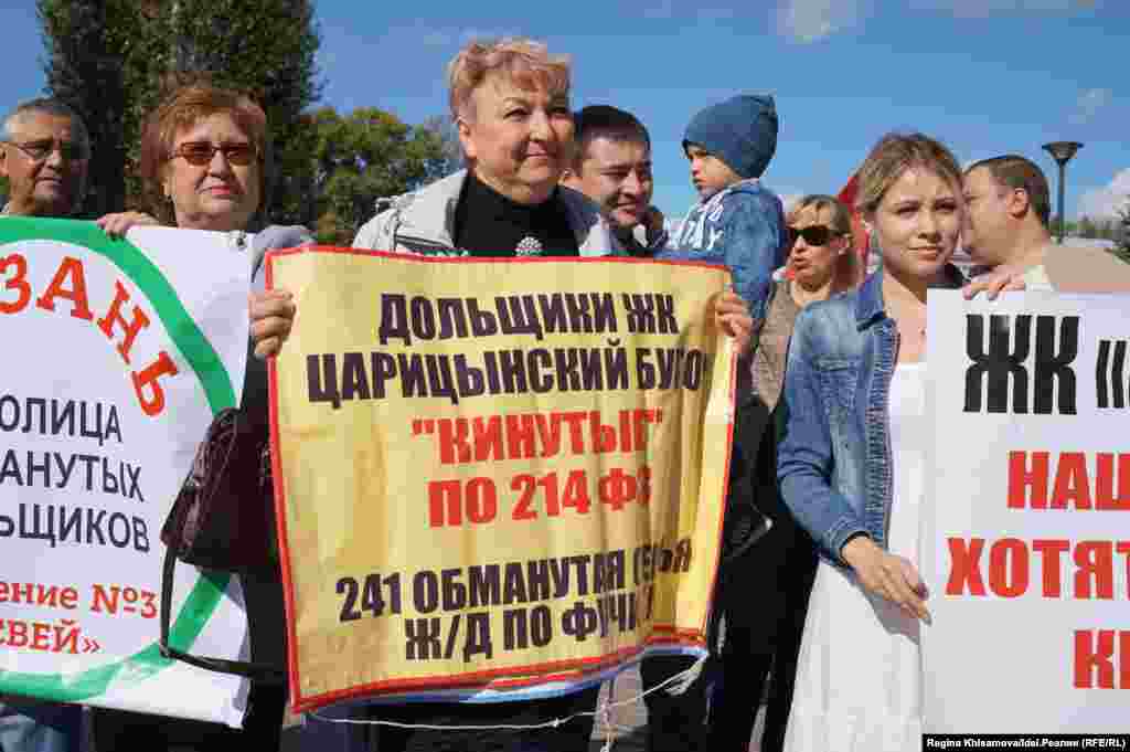 "Казань — столица обманутых дольщиков!", "Мы хотим в свой дом!", "Президент РТ, спасибо вам за мое бездомное детство", "Ждем возобновления строительства", "Наши дети тоже хотят жить в своих квартирах" — с такими плакатами вышли митингующие. Смотрите другие наши фотогалереи здесь.