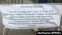 В пятницу вечером на сайте мэрии Самары появилось официальное сообщение, что митинг протеста 7 октября на площади имени Кирова не согласован с властями. Городские чиновники предупредили горожан об ответственности за участие в несанкционированной акции оппозиции.