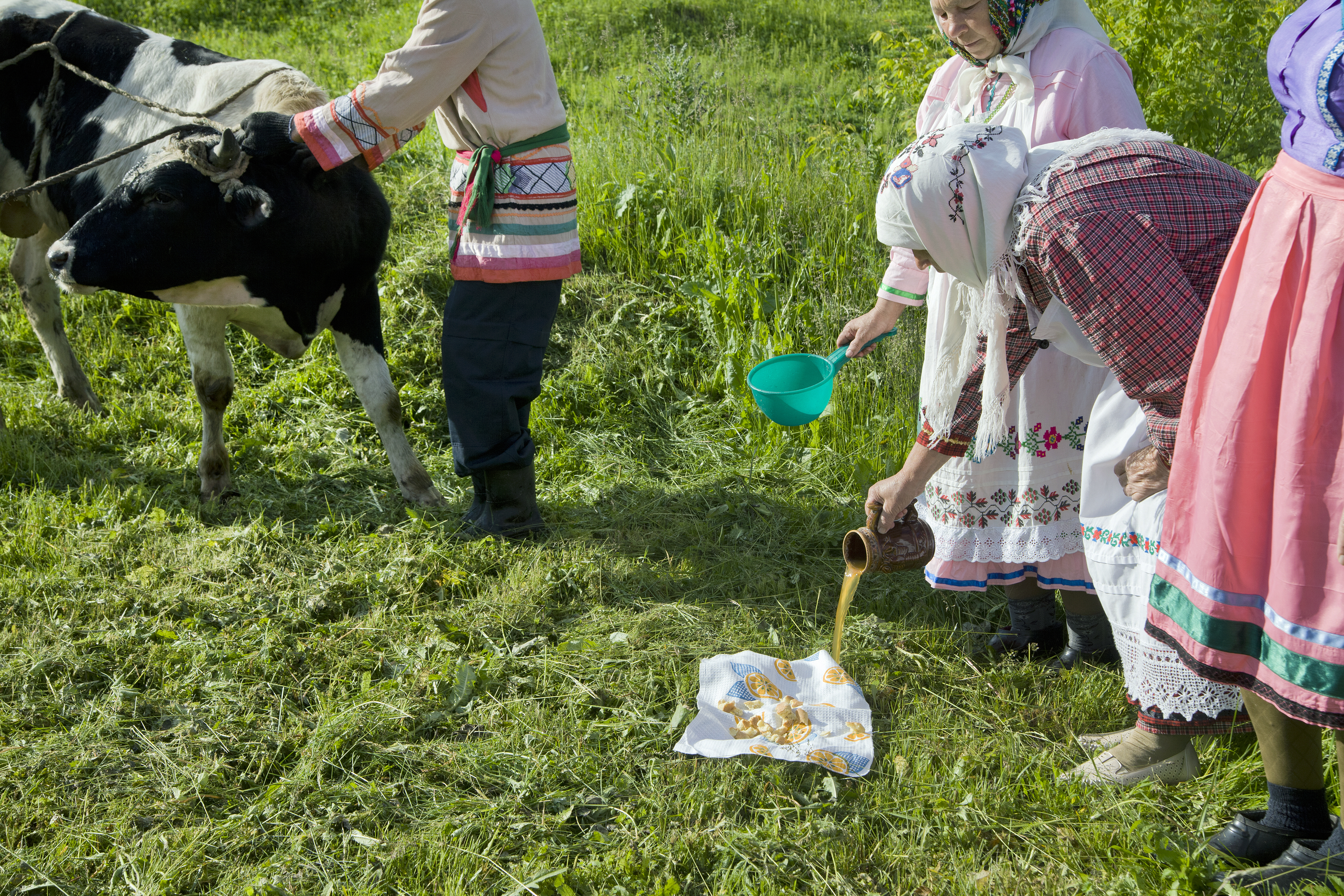 Женщины забирают полотенце и лепешку в нем и уходят к ручью, чтобы отпустить хлеб по течению. Один из мужчин в это время гладит бычка по голове.