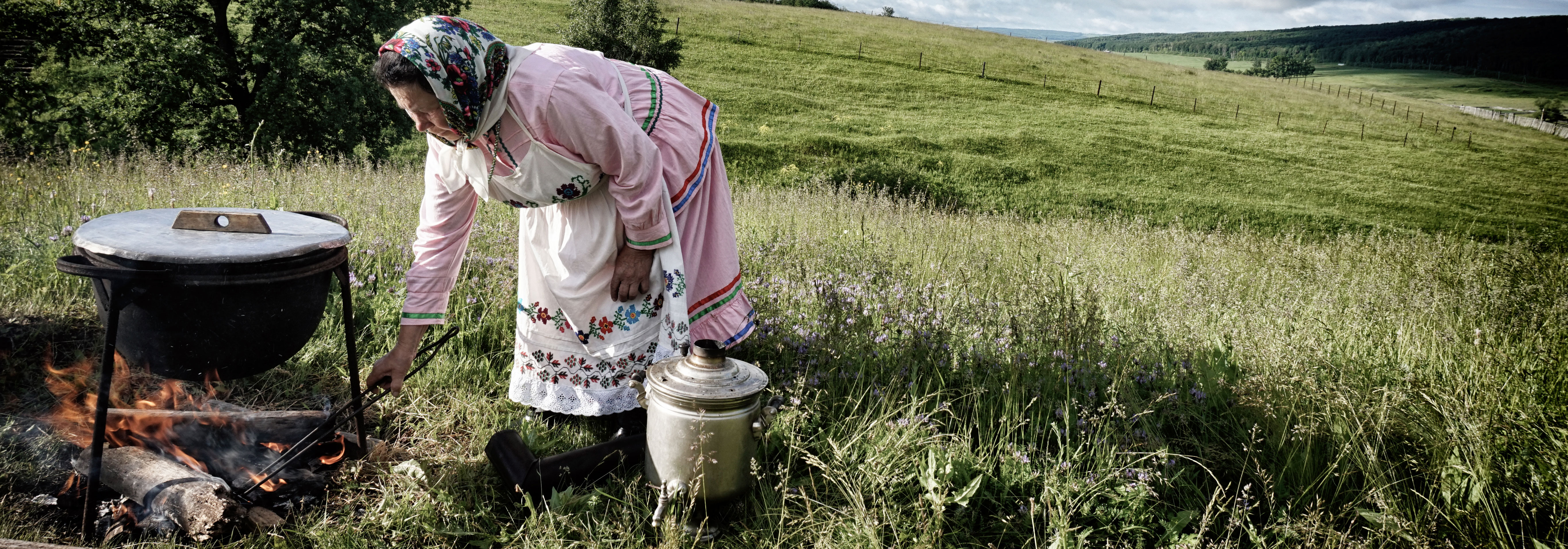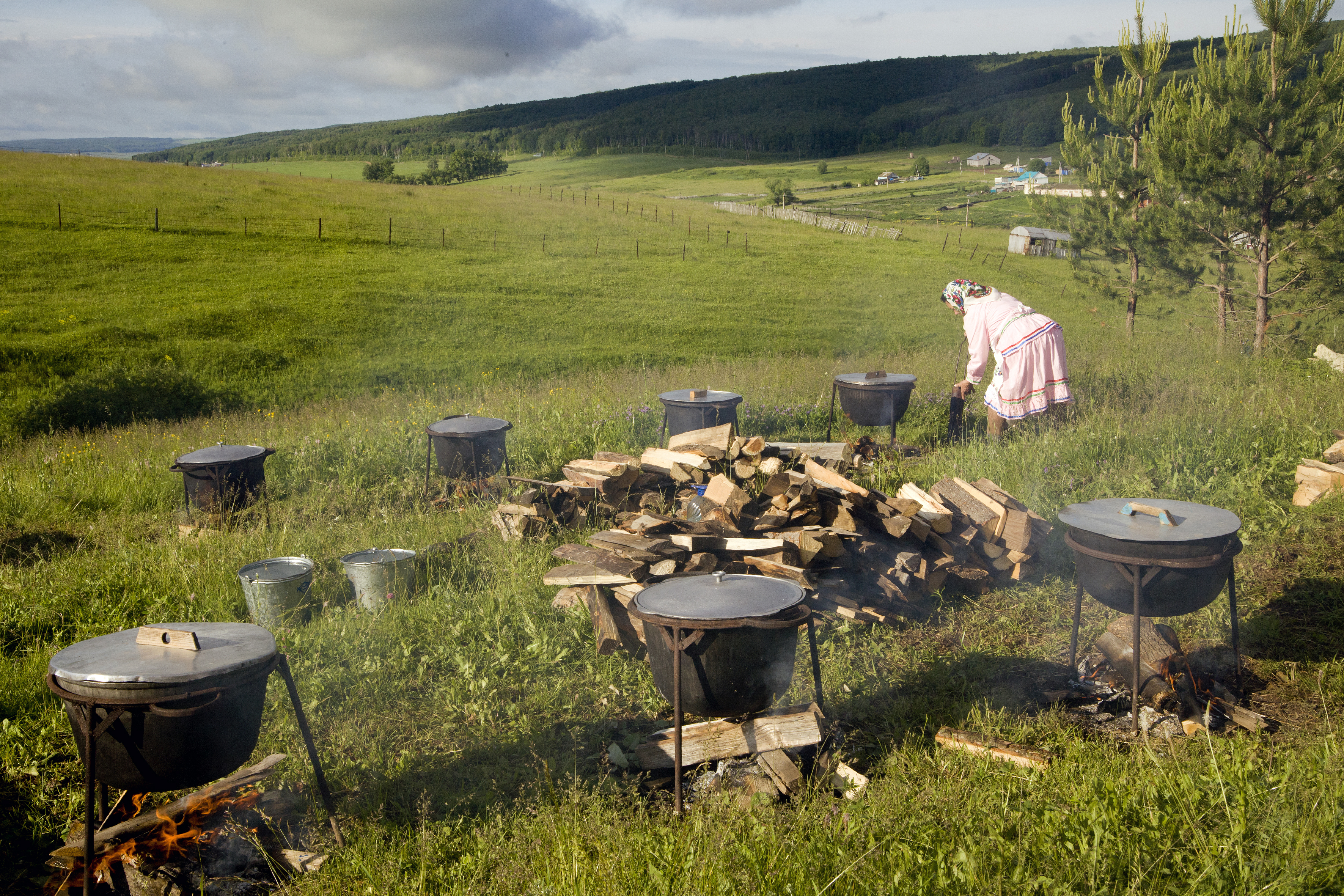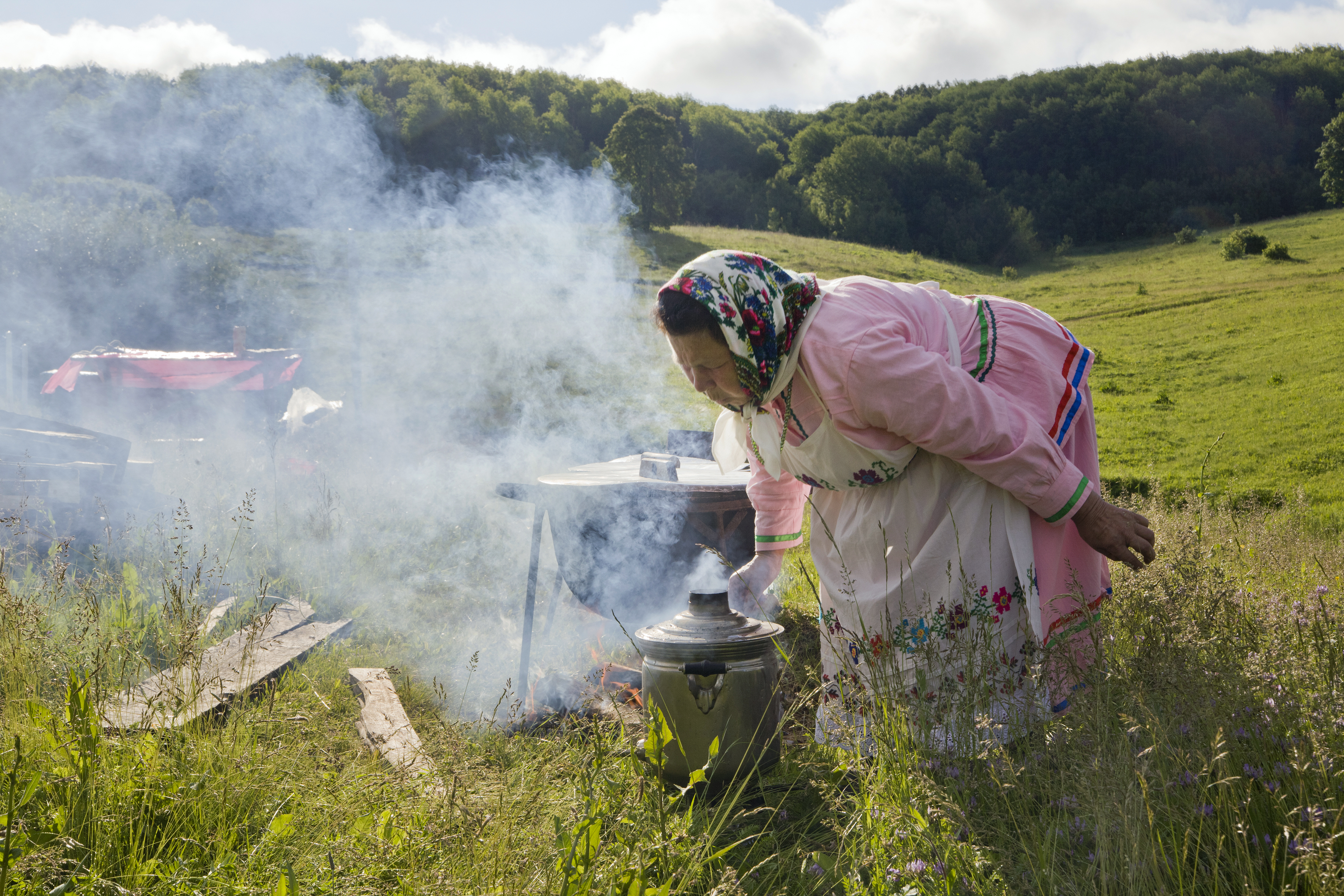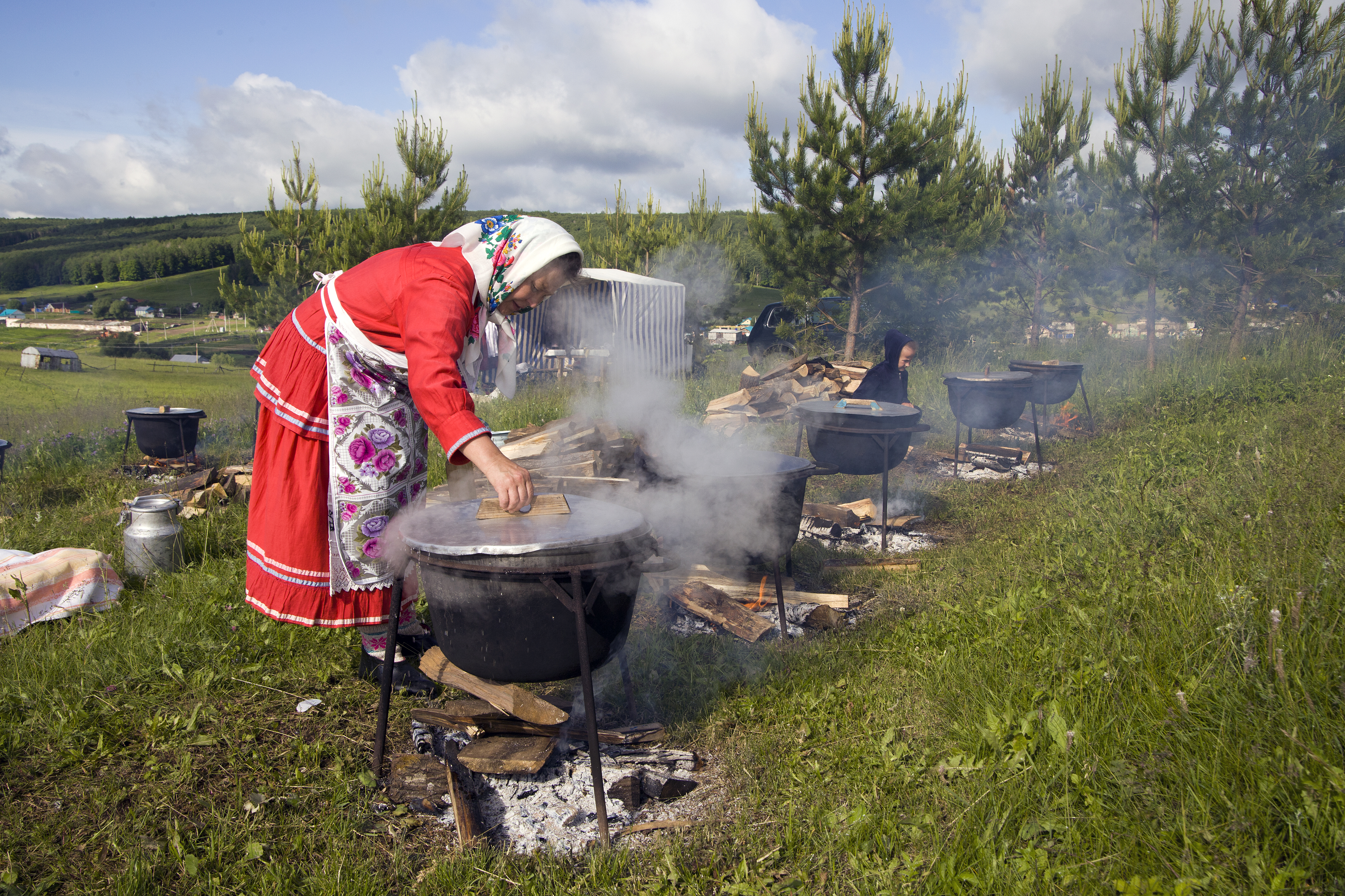 Рано утром на одном из зеленых холмов у села, где из-под земли бьет священный для местных чувашей родник, собралось с два десятка человек в национальной одежде. Их видно издалека — почти все они в красном или розовом одеянии, а с высокого холма уходят ввысь столпы дыма от десяти костров. На каждом из них котлы, в них — закипает вода.