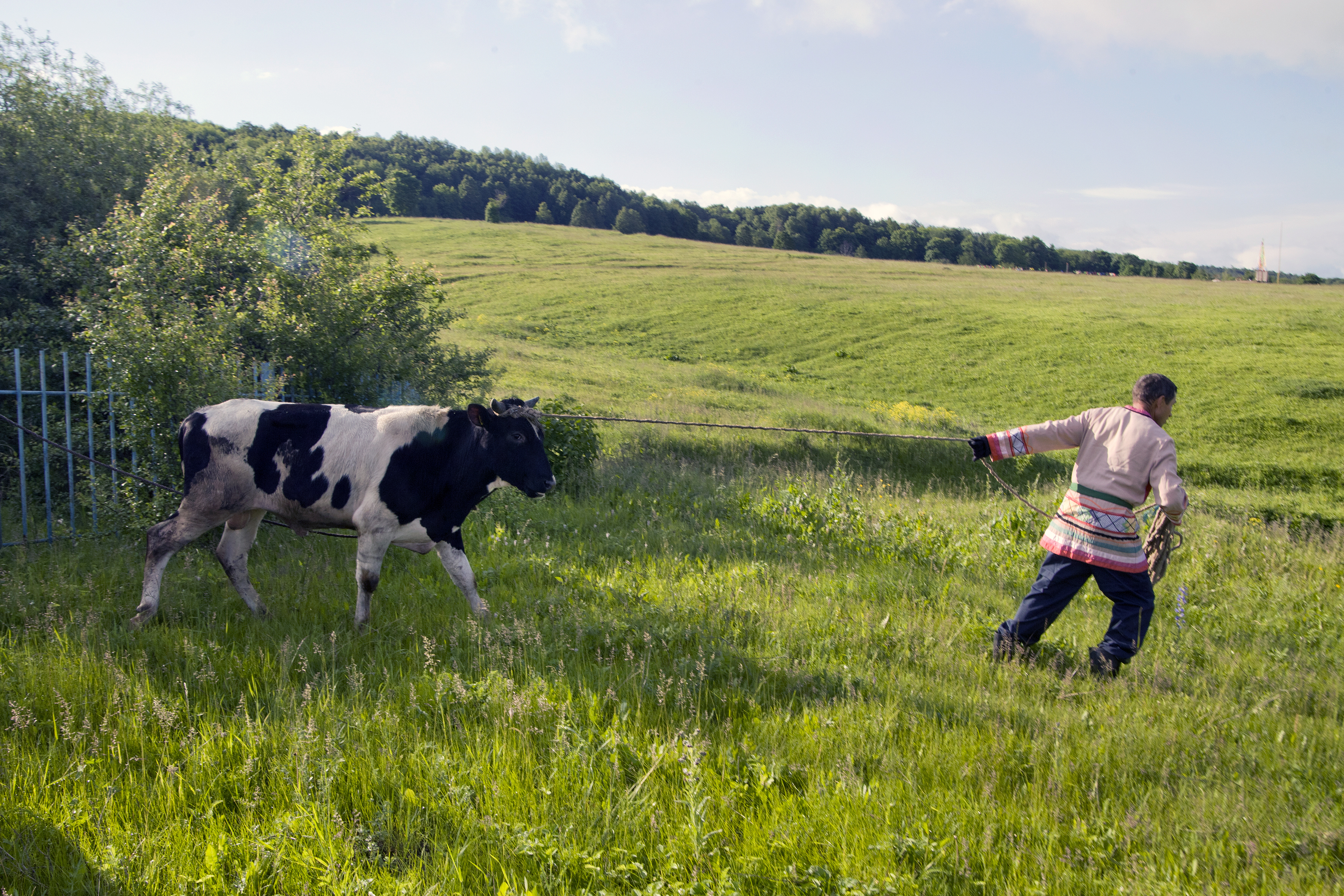 Через пару минут молитвы. Галина Бикбова (именно она ее и читала) кладет полотенце на траву и, отрывая от лепешки кусочки, кладет их на него. Другая женщина поливает водой голову бычка. Животному это не нравится, и он пытается вырваться.