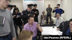 Полицейские явились в штаб Навального к вечеру, когда там стали собираться волонтеры, чтобы обсудить итоги акции "Он нам не царь!", прошедшей 5 мая, и наметить планы на ближайшее будущее.