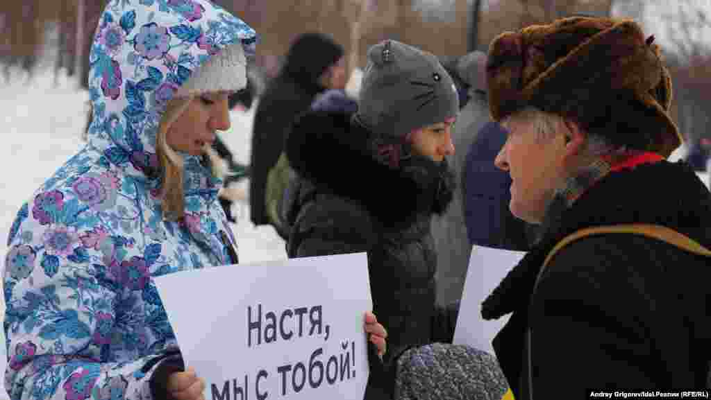 В Казани прошел пикет в поддержку активистки "Открытой России" из Ростова-на-Дону Анастасии Шевченко, в отношении которой возбуждено уголовное дело. Она находится под домашним арестом. Один из плакатов призывал прекратить преследование казанской активистки Гульназ Равиловой. Член совета татарстанского отделения "Открытой России" на днях сообщила о преследовании своего отца.