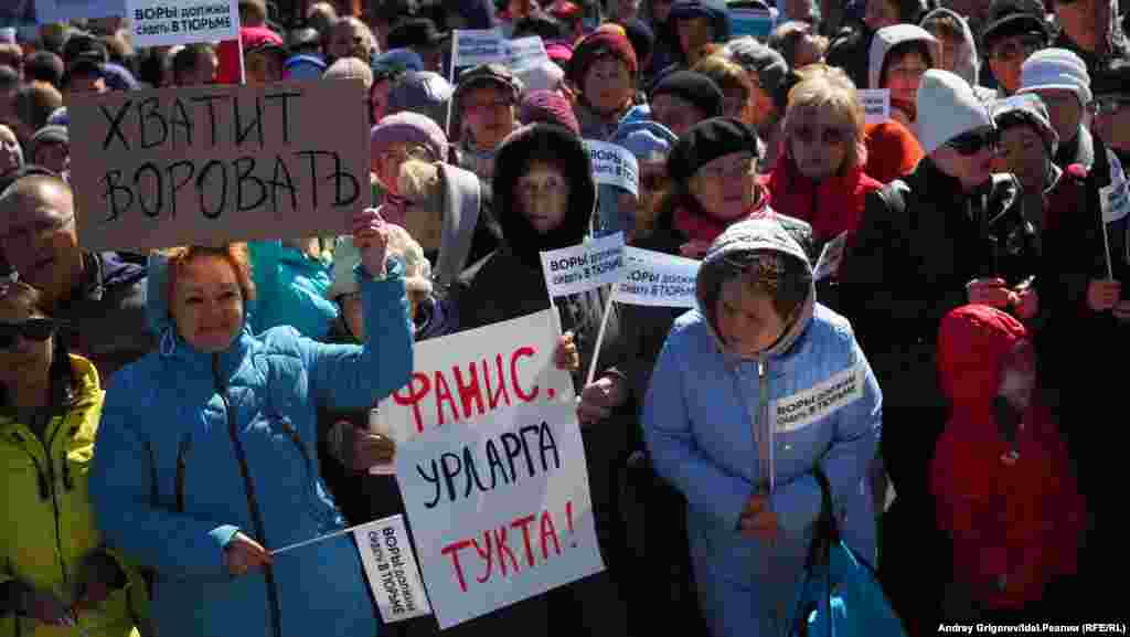 Свыше тысячи участников собралось 14 апреля в Елабуге, на старом майдане. Жители города предпочли антикоррупционный митинг официально спущенному "сверху" празднику встречи весны (последний был экстренно назначен на эту же дату администрацией Елабуги.