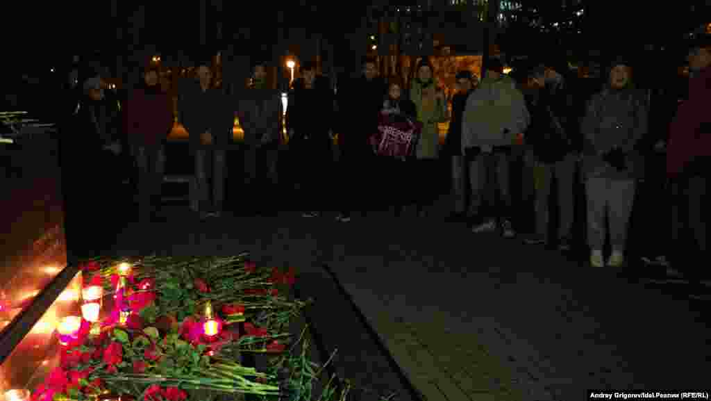 День памяти жертв политических репрессий в Казани завершился традиционным возложением цветов у памятника жертвам репрессий в Ленинском садике. В семь вечера здесь собралось около сорока участников акции.