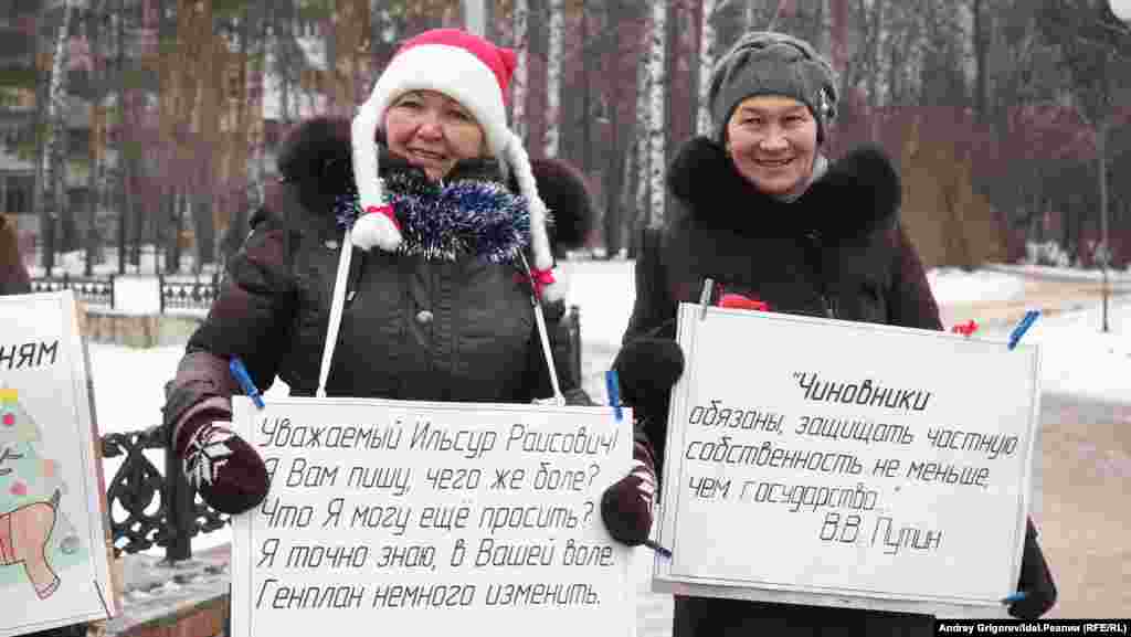 В последнее воскресенье уходящего 2019-го жители казанского микрорайона Танкодром вновь вышли на акцию протеста. На сей раз — в новогодних нарядах костюмах снегурочек и дедов морозов и мишурой, накинутой на плечи. Правда, настроение собравшихся было совсем не новогодним, в руках люди держали те же плакаты, что и два месяца назад — с просьбами не сносить их дома и чтить частную собственность.