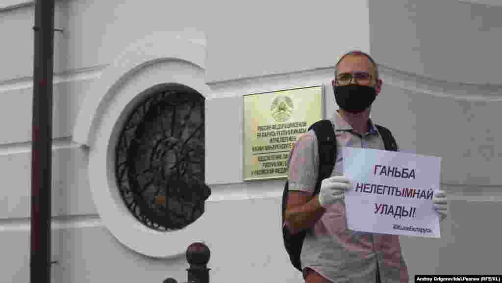 Почти час простоял в одиночном пикете с плакатом "Ганьба нелегітымнай улады!" ("Позор нелегитимной власти!") у отделения посольства Республика Беларусь в Казани активист и социолог Искандер Ясавеев. Отделение расположено в одном дворе с республиканскими структурами, крыльцо — под прицелом нескольких камер, но за целый час к Искандеру так ни разу и не вышел ни один полицейский, который заинтересовался бы надписью на плакате и доложил «наверх» о случившемся.