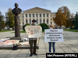 — Сегодня наш пикет посвящен Кыштымской катастрофе, которая произошла 29 сентбря 1957 года. Пикет посвящен впервую очередь антиядерной теме, но в том числе и экологически опасным проектам. К ним мы в первую очередь относим мусоросжигательный завод, радиационное облучение иловых полей, а также проекты Генерального плана Казани, к которым относятся трасса М12 и трасса в Дербышках. Уничтожаются леса, флора и фауна, а также эти трассы идут через жилые массивы. Мы также выступаем против радиационных могильников в Крутушке, против облучения продуктов питания и ввоза радиационных отходов из Германии. Вот это все — опасные проекты, — считает организатор акции председатель Антиядерного общества Татарстана Альберт Гарапов.