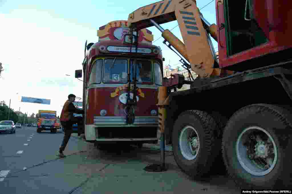 Трамвай-трактир "Пятёрочка" сошёл с рельс и перекрыл проезжую часть на улице Декабристов у остановки Гагарина. Июнь 2007 года.