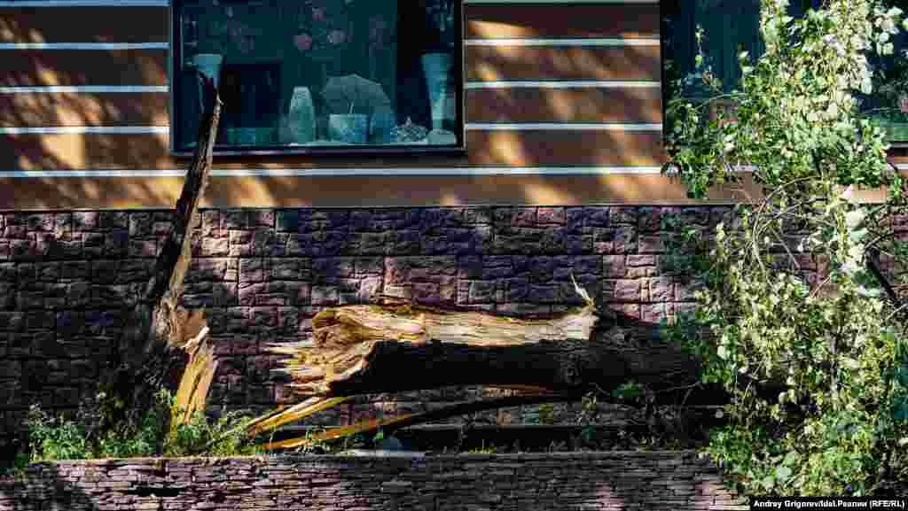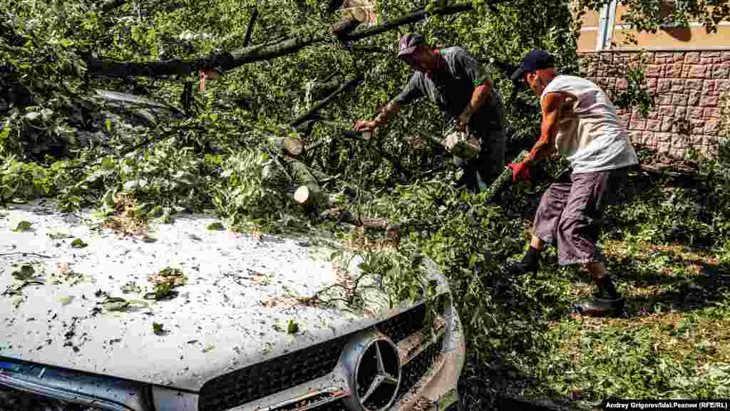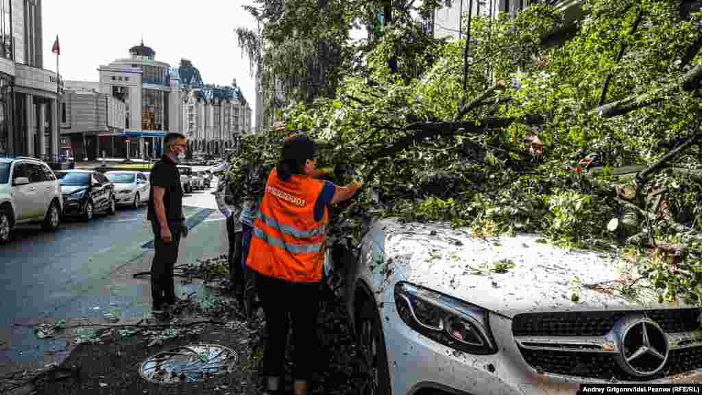 Свидетелем разбора завалов на фешенебельной улице Бассейная, спускающейся от Малой Красной к Пушкина мимо Верховного суда Татарстана, стал корреспондент "Idel.Реалии". Здесь дерево рухнуло сразу на несколько припаркованных у тротуара машин.