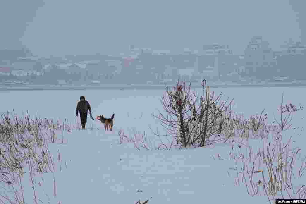 Эта намытая около десяти лет на Казанке назад территория, расположенная вдоль улицы Сибгата Хакима, давно уже превратилась для казанцев, живущих в многоэтажках поблизости, в своего рода парк дикой природы. Летом на песчаных барханах, которые сейчас скрыты снегом, загорают, осенью собирают облепиху с многочисленных кустов и кормят уток, плавающих в заливе, зимой катаются на лыжах и выгуливают собак.