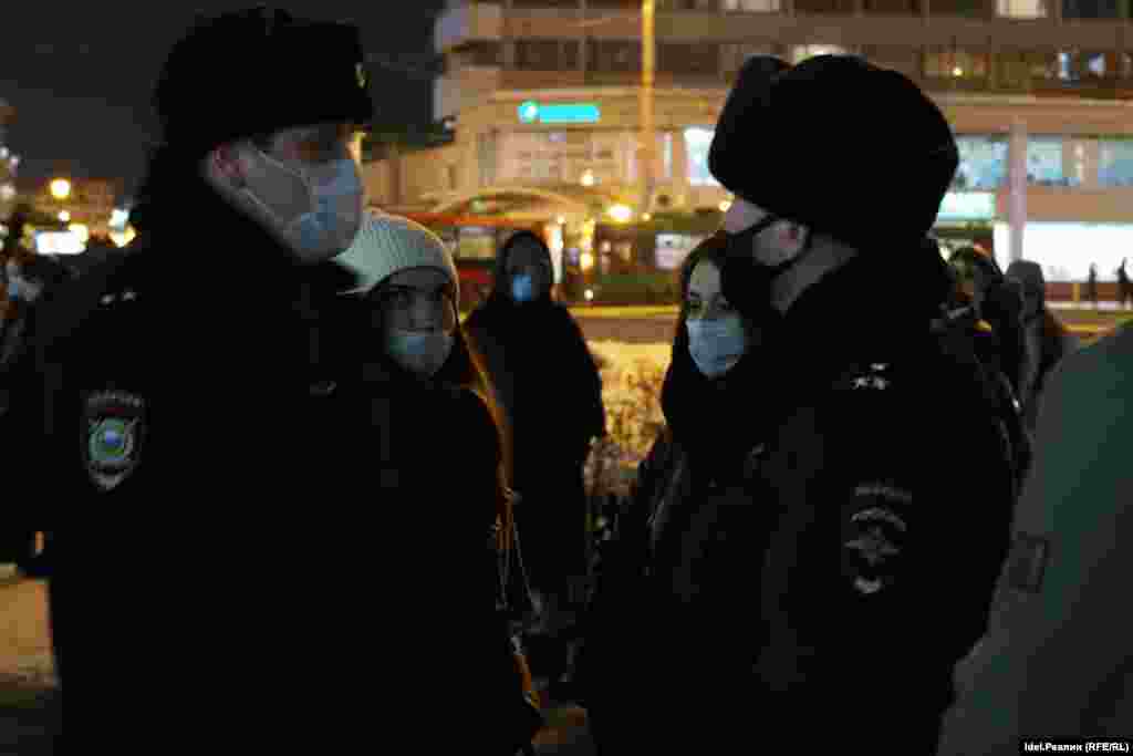 Еще до начала акции у остановки "площадь Тукая" припарковались несколько полицейских машин. Еще раньше на забор рядом с площадкой кто-то успел нанести надпись "Нет войне!!!".