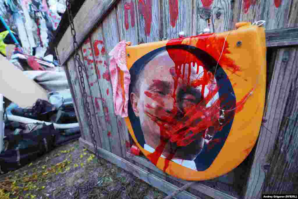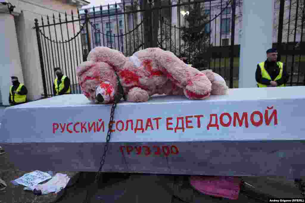 Наибольший фурор вызвало появление у забора посольства собачьей конуры и гроба с надписью "Русский солдат едет домой. Груз 200".