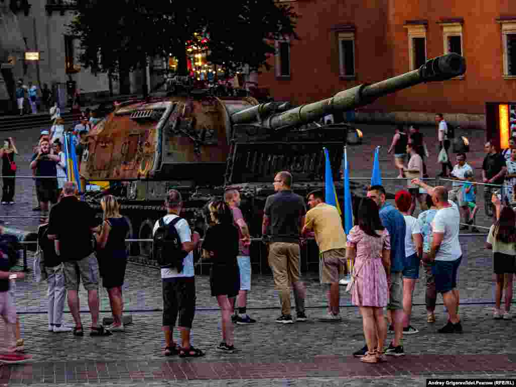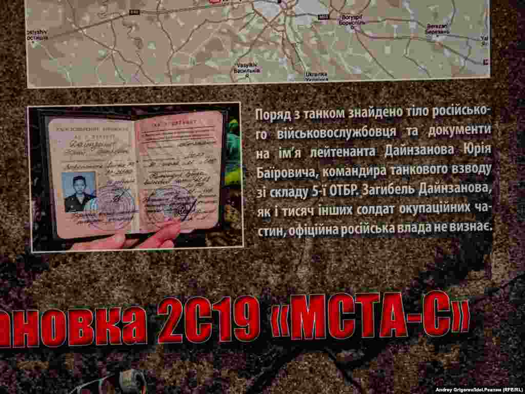 "За вашу и нашу победу!" — так называется выставка, которая открылась прямо под открытым небом на Замковой площади Варшавы в конце июня. На выставке представлена трофейная техника, подбитая украинскими военными весной 2022 года: танк Т-72БА и самоходно-артиллеристская установка 2С19 "МСТА-С". Танк, как следует из пояснений на стенде, был подбит в бою 31 марта на окране села Дмитровка Бучанского района Киевской области. Рядом с танком найдено тело российского танкиста и документы на имя Юрия Дайнзанова. Как гласит надпись на развороте удостоверения, командир танкового взвода лейтенант Юрий Дайнзанов, родившийся 14 февраля 2000, окончил 30 июля 2021 года Казанское высшее танковое командное училище. Место постоянной дислокации войсковой части 46104 — станция Дивизионная под Улан-Удэ в Бурятии.