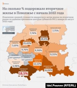 На втором месте по росту цены квадратного метра оказалась Удмуртия — 18,4%, на третьем — Оренбургская область (16,04%). В начале года "средний" метр в Удмуртии стоил 47 222 рубля, к августу 2022 года он подорожал до 55 913 рублей. В Оренбургской области метр вторички подорожал с 56 637 рублей до 65 723 рублей.