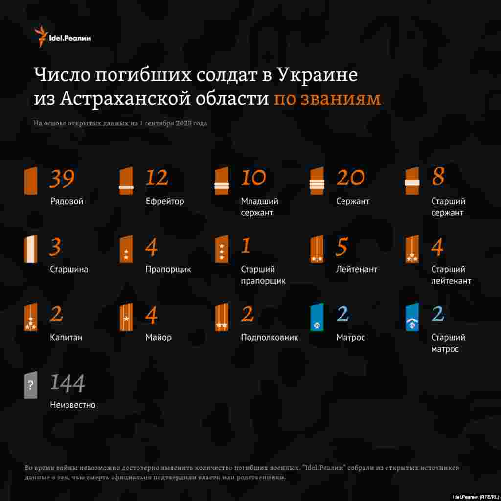 Как минимум 140 уроженцев Астраханской области в возрасте до 35 лет признаны погибшими в Украине с начала войны. Из общего числа погибших 103 человека числились контрактниками — это те, кто находились в составе действующей армии страны на момент начала войны в Украине (24 февраля 2022 года) или подписали официальный контракт с Министерством обороны России уже после ее начала. Они служили в регулярной армии. Еще 53 человека были наемниками (47 из них служили в ЧВК "Вагнер"); 33 — мобилизованными; 16 — добровольцами.