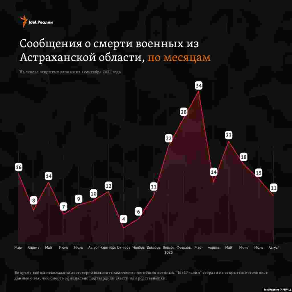 Как минимум 140 уроженцев Астраханской области в возрасте до 35 лет признаны погибшими в Украине с начала войны. Из общего числа погибших 103 человека числились контрактниками — это те, кто находились в составе действующей армии страны на момент начала войны в Украине (24 февраля 2022 года) или подписали официальный контракт с Министерством обороны России уже после ее начала. Они служили в регулярной армии. Еще 53 человека были наемниками (47 из них служили в ЧВК "Вагнер"); 33 — мобилизованными; 16 — добровольцами.