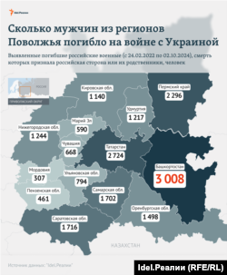 — Татаро-башкирская служба Радио Свобода ведет собственный подсчет погибших на войне добровольцев и не только их. В этом списке представлены только те, чью смерть так или иначе признала российская сторона, родственники погибших, учебные или другие общественные заведения, к которым эти люди имели отношение. Реальные цифры могут быть значительно выше. Так вот, согласно подсчетам "Idel.Реалии", с начала полномасштабного вторжения России в Украину погибло как минимум двадцать тысяч уроженцев и жителей Поволжья. Башкортостан — лидер по количеству погибших не только в Поволжье, но и в целом по России. Война унесла в этом регионе жизни как минимум уже более трех тысяч солдат. Далее в списке Татарстан — там чуть меньше трех тысяч. Пермский край — там чуть более двух тысяч и так далее. Как вы думаете, почему Татарстан и Башкортостан в лидерах?